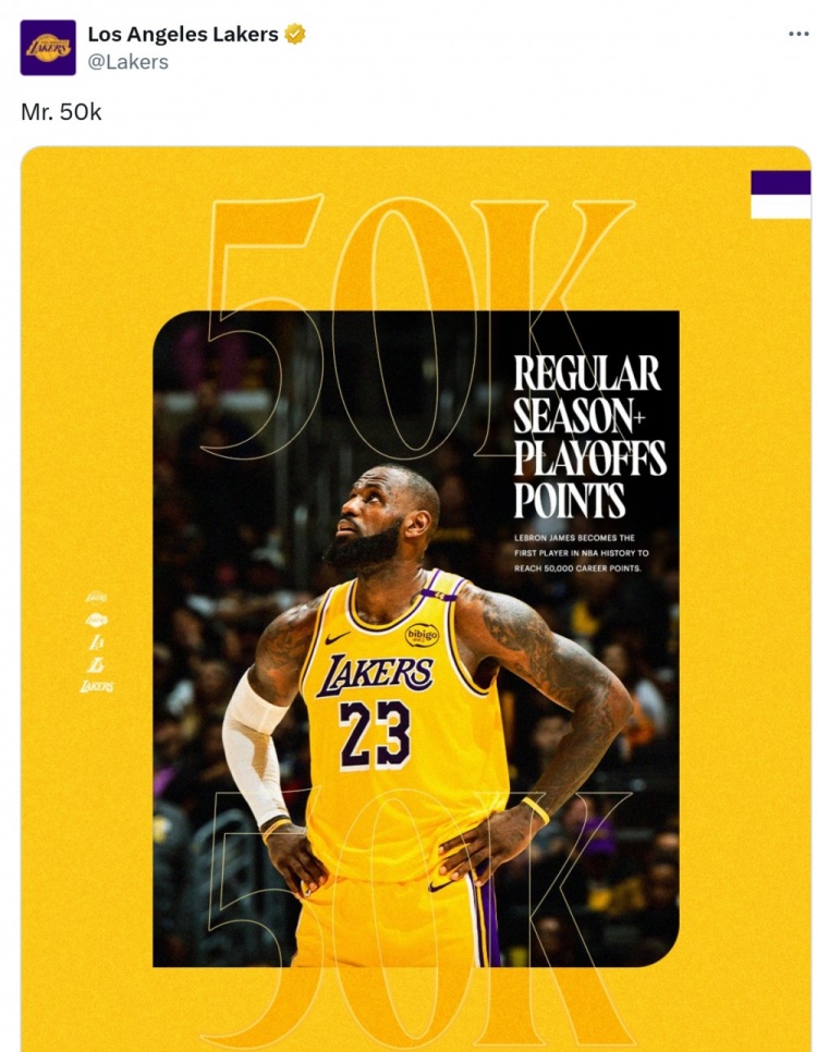 詹姆斯生涯50000分!湖人官方晒照:五万分先生