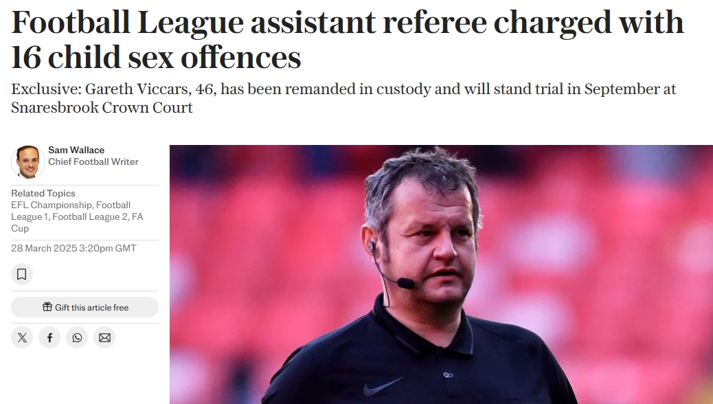 46岁的加雷斯·维卡斯是一名边裁,自2018年以来还被选为足总杯和联赛杯比赛的官员,他被控12项与儿童发生性行为的罪名。此外,他还被控两项与儿童进行性交流的罪名;一项在性诱导后与儿童会面的罪名;以及一项在儿童面前从事性行为的罪名。
