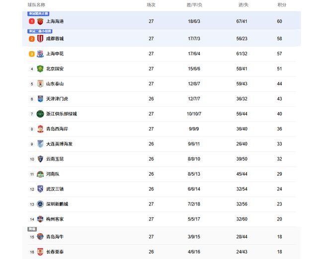 - 中超 | 中甲第27轮结束了5场比赛,最新积分榜如下!