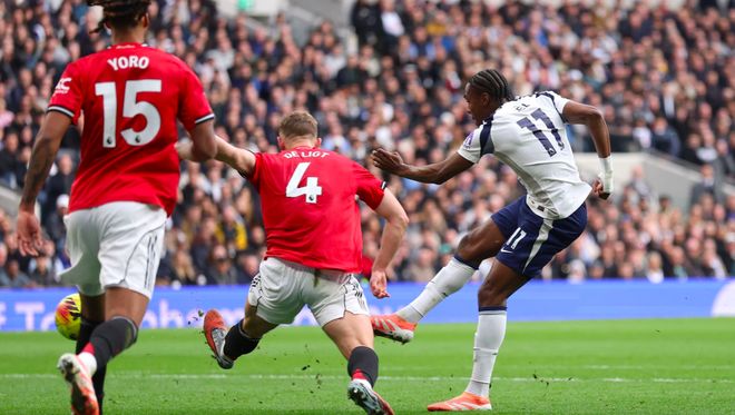 第31分钟,热刺后防出现失误,曼联立即开始强势进攻,阿玛德迪亚洛传中,姆贝莫头球攻门,维卡里奥只能目送皮球入网。