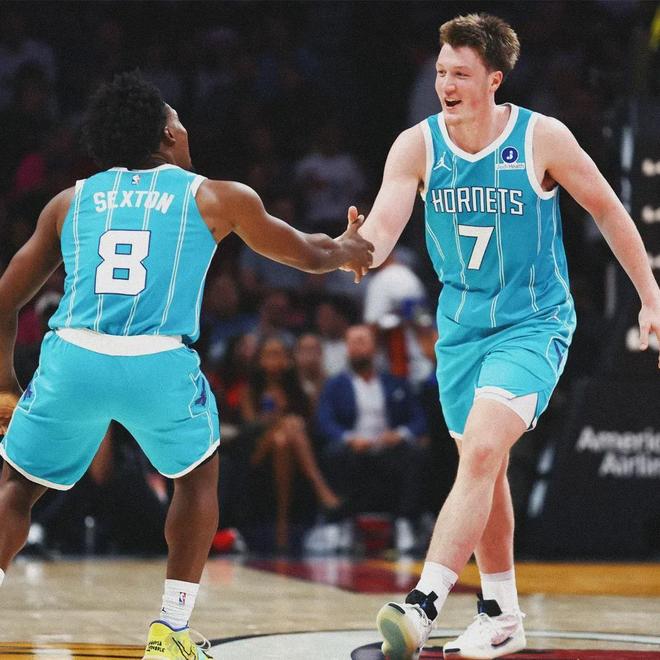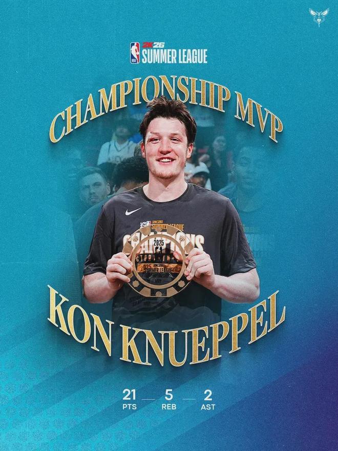 场均16.6分,新秀排行第一。进3.2个三分,也是新秀排行第一。就差一个助攻,他就差点成为第一个拿到三双的25届新秀。篮球专家比尔-西蒙斯信誓旦旦地说,这个小伙子未来会在2028年的美国男篮国家队有一个位置。他叫康-克努佩尔,今年20岁,休赛期刚给黄蜂赢了一个夏联冠军。