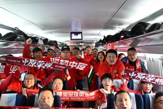 12月6日,河南队球迷在G1801次列车上为球队加油助威。12月5日至6日,国铁集团郑州局共开行六列球迷专列,方便球迷观赛。 新华社发