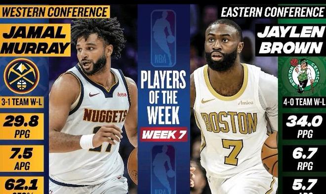 公布球队实力榜的同时,NBA官方还公布了上周的周最佳球员;其中西部正是由掘金二当家贾马尔-穆雷当选,而东部由凯尔特人前锋杰伦-布朗当选。上周比赛里,贾马尔-穆雷共出战4场,场均得到29.8分7.5助攻,三分球命中率62.1%,率领掘金拿到3胜1负。杰伦-布朗共出战4场,场均贡献34分6.7篮板5.7助攻,率领凯尔特人4战全胜。对于凯尔特人来说,尽管没有塔图姆,休赛期又损失了霍勒迪、波神、霍福德等多名夺冠功臣,但由于球队拥有深厚的强队文化底蕴;再加上布朗上任球队老大后也没有辜负大家的期望,持续进化,凯尔特人得以继续保持季后赛实力。