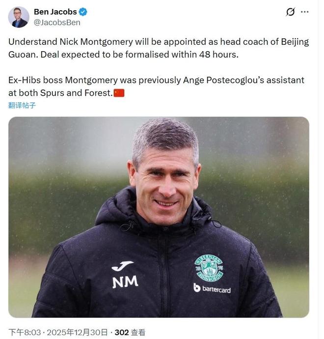 北京时间12月30日,来自知名记者雅各布斯(Ben Jacobs)的确认,44岁的苏格兰少帅尼克-蒙哥马利,即将出任中超豪门北京国安主帅,预计正式协议在48小时内签署。