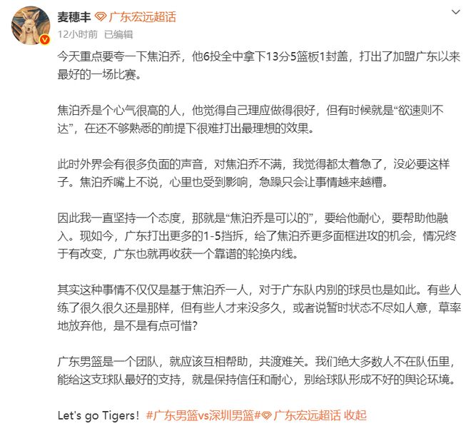 CBA常规赛继续进行,广东110-105战胜深圳,焦泊乔打出本赛季加盟广东以来的最好表现,他6投6中得到13分,还抢下5个篮板球。
