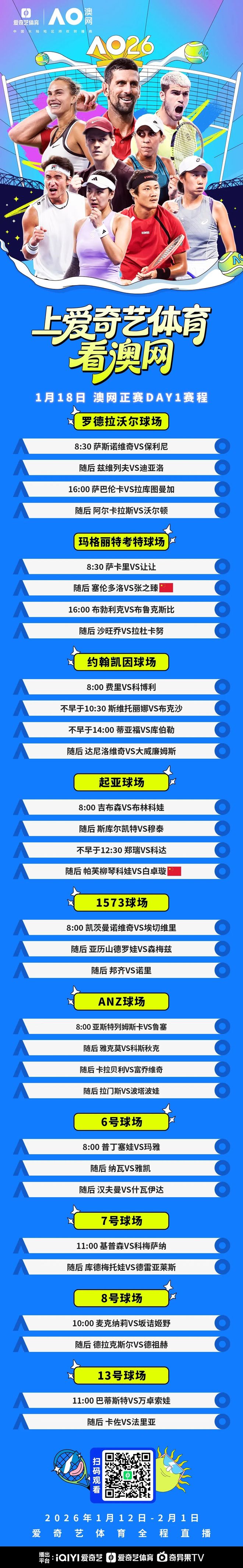 北京时间1月18日,2026澳网正赛正式挥拍。本届澳网,爱奇艺体育全程直播。
