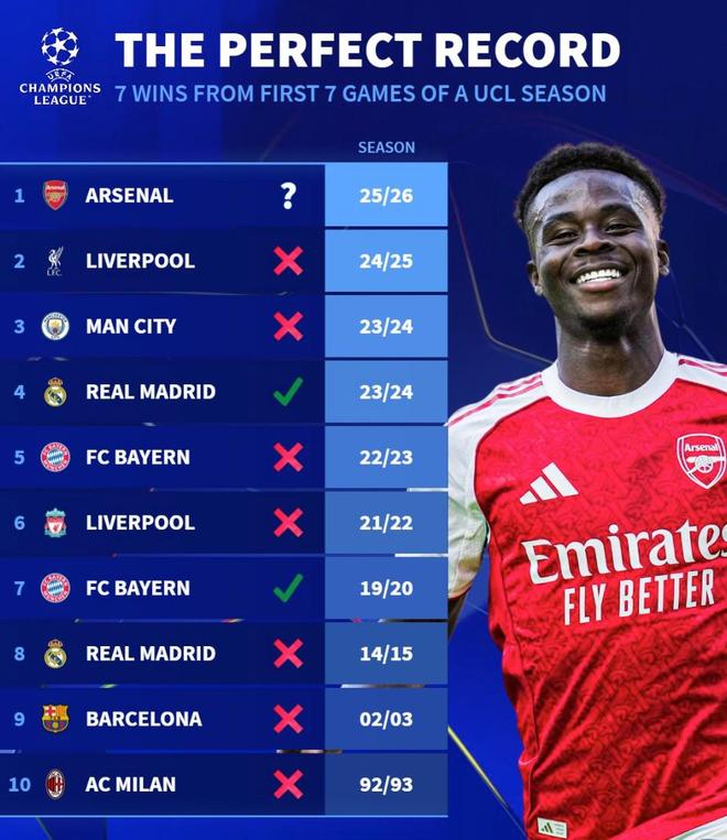 - 欧冠 | 阿森纳是欧冠历史第10支开季7连胜的球队,此前仅2队最终夺冠